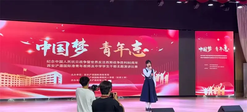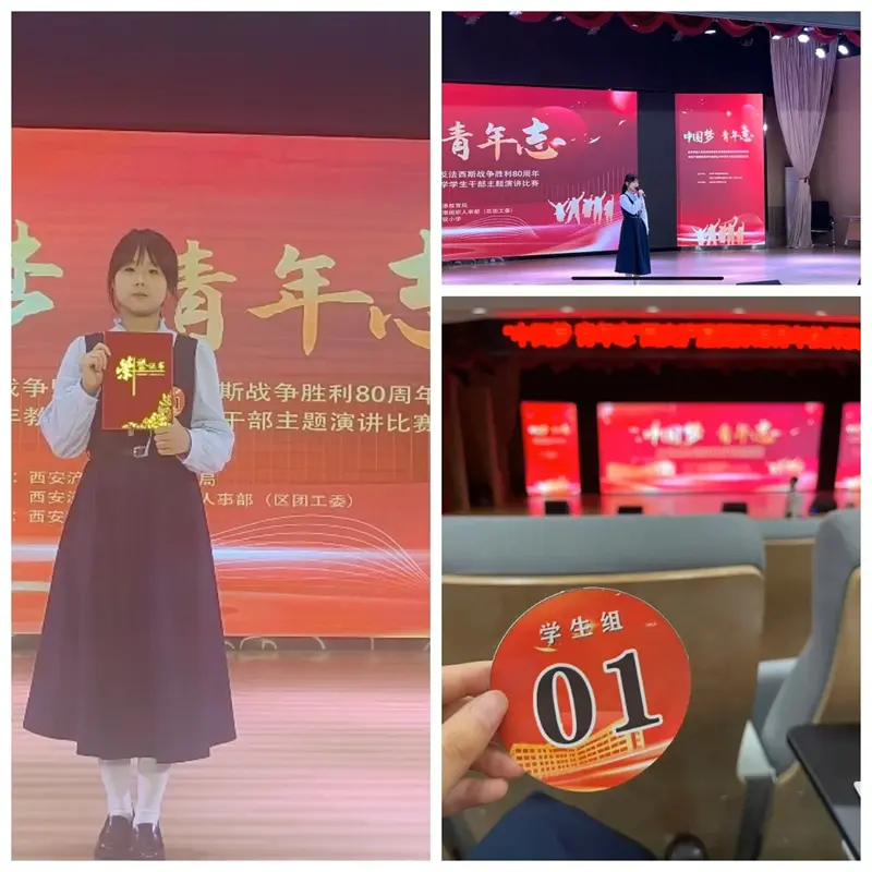 2025年9月16日下午,由西安浐灞国际港教育局主办的“中国梦·青年志”——纪念中国人民抗日战争暨世界反法西斯战争胜利80周年青年教师及中学生干部主题演讲比赛圆满落幕。我校高三学生孙清扬同学在全区中小学、幼儿园及职业学校的选手中,从初赛突围,到复赛菁英荟萃,经过一番鏖战,她以出色表现荣获二等奖的优异成绩。
