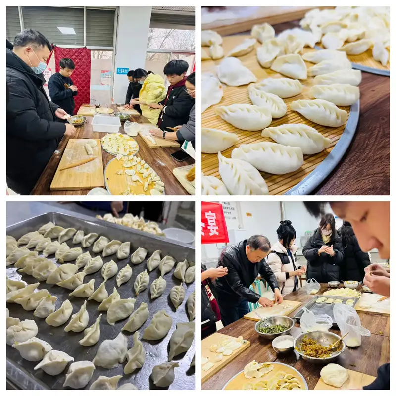 包饺子喽桌上摆好饺子皮和馅料,师生们在食堂里分工协作,捏出各式饺子,相互交流手法,欢声笑语不断。