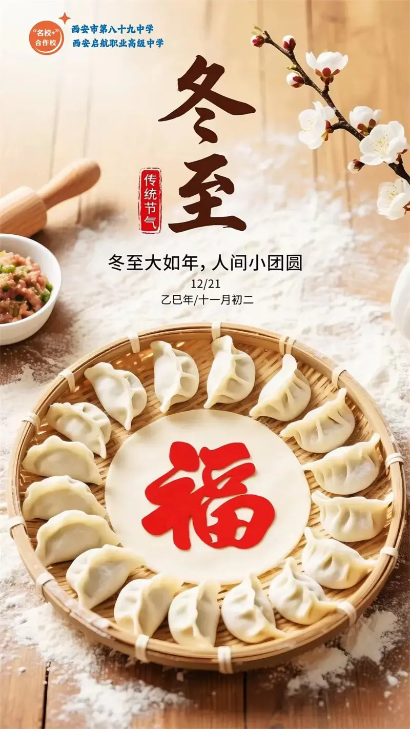 冬至快乐“冬至大如年,人间小团圆。”作为传统节气,冬至承载着浓厚的文化底蕴。2025年12月21日下午,西安启航职业高级中学开展包饺子活动,引导学生了解传统节日,丰富校园生活。