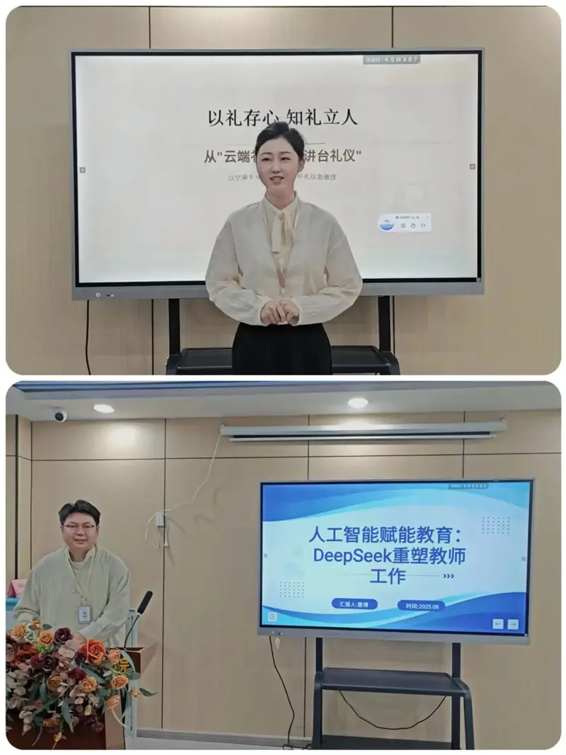 礼修于心,仪养于行。开学伊始,我校中级礼仪培训师周希子为全校教师进行文明修养和教师礼仪培训。信息技术课教师惠博进行AI赋能,质效提升,“人工智能赋能教育DeepSeek重塑教师工作”培训。